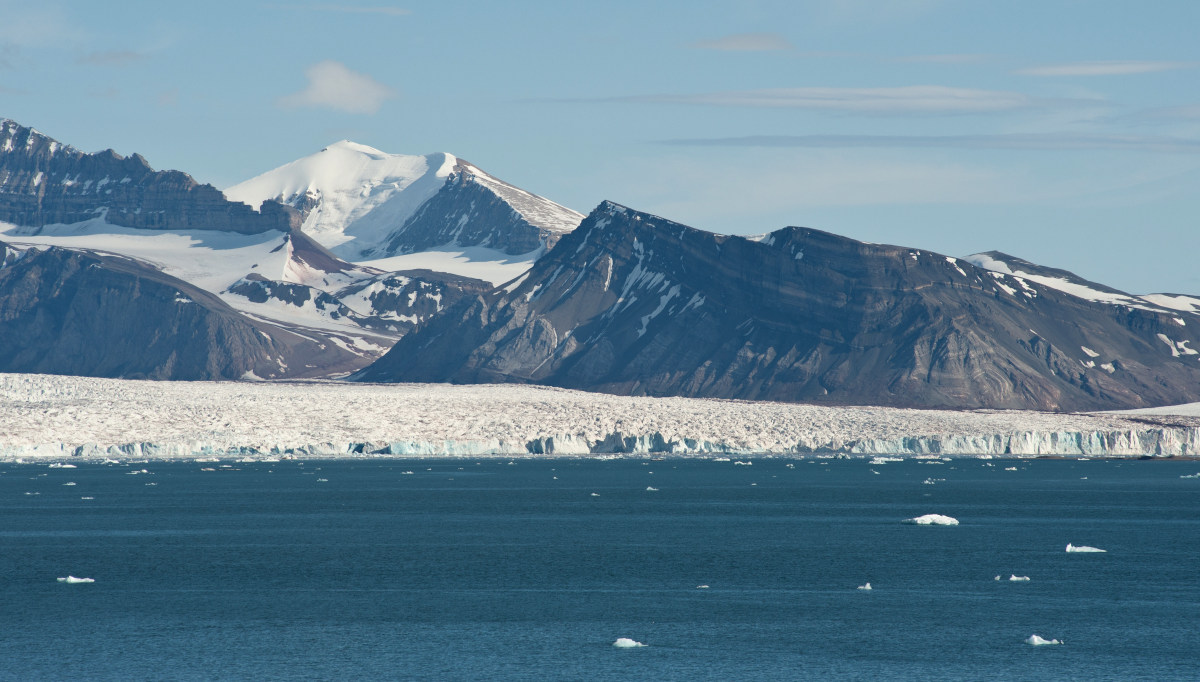 Glaciers snake down to the sea, shedding ice into the Kongsfjorden as we sail up towards Ny Alesund.